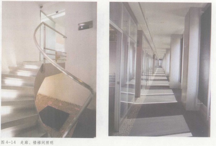 走廊照明注意不要造成由相邻场所往返的人眼睛的不适。荧光灯之类的线状灯具横跨布里可使走廊显得明亮,也可以根据室内设计风格设定导向明确的局部灯光,既可以保障基本照度,又有一定的趣味性(图4-14 )。