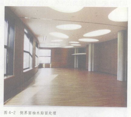 办公室的侧界面处于室内视觉感受较为显要的位置。造型和色彩等方面的处理仍以淡雅为宜,以利于营造合适的办公氛围,侧界面常用浅色系列乳胶漆涂刷,也可贴以墙纸,如隐形肌理型单色系列的墙纸等,有的装饰标准较高的办公室也可用胶合板做面材,配以实木压条,根据室内总体环境以及家具、挡板等的色彩与质地,木装修的墙面或隔断可选用以柳按、水曲柳为贴面的中间色调,或以桦木、枫木为贴面的浅色系列。色彩较为凝重的柚木贴面,通常较多地用于小空间、标准较高的单间办公室内(图4-2)。