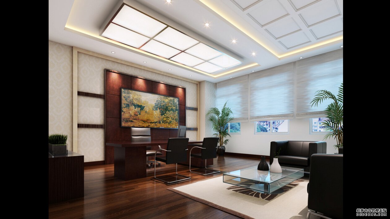 软装饰的魅力也表现在办公室设计装修陈设中的对比关系上。质地光亮自然的木纹家具与柔和、松软的织物形成鲜明的对比。光亮的家具在室内空间中容易给人一种冷漠感,而织物柔和的质地,自然流畅的褶纹及富于变化的纹样、色彩,又给这样的空间带来暖意和柔情,彼此映衬,使得空间气氛祥和、协调。
