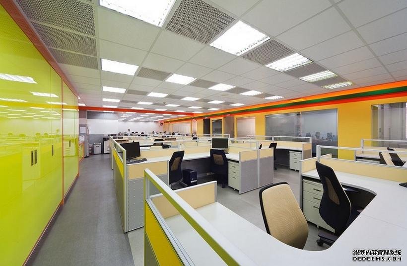 在办公室室内空间的装修装饰设计效果体现上,色彩的运用在办公室室内空间装修装饰中是必须采用表现方法之一,将主颜色大块涂在墙面的做法已经不适应现代的装修装饰的时尚潮流,虽然大色块对人们的视觉冲击力量最强大,但办公室仍然有别于商铺、饭店等场所。