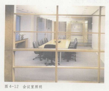 会议室的家具布置没有办公室那么复杂,使用功能也较单一,主要是解决会议桌上的照度达标的问题,照度应该均匀,同时,与会者的面部也要有足够的照明,保证与会者相互之间能够清晰地看清楚对方的表情,尤其应该保证在有窗的情况下防止靠窗的人们显示出轮廓而需要的面部照度。通常,使人的面部表情有足够的垂直照度就能够解决这种现象(图4-12)。