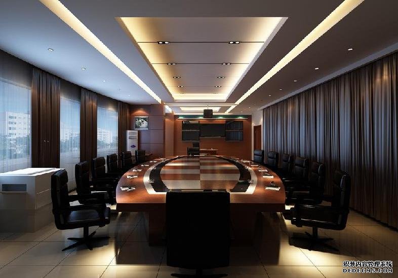会议室的光线应较为明亮。除了在使用投影幕的时候需要一种较暗的光线环境外,其它的时候,明亮的光线,反而容易使客户的心态放松。很多人在设计时有一个误点,就是会议室往往只比会议桌稍大一点的,这样极容易使客户产生一种拘谨的心态。一个适当大小,留有一定活动空间的会议室,往往能使客户的心理松懈,有利于洽谈。