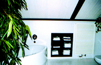 青灰色的抛光 地砖 、淡黄色 大理石 台面,古香古色的柚木镜框增添雅致气息。卫浴采用铝合金 推拉门 作为 隔断 ,产生独特的视觉效果。