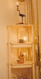 .墙角往往还有暖气管道与空调管道,十分杂乱。我干脆立起一个塑料三角架,又摆上心爱的油灯,烛台等工艺品,并用 窗帘 柔化了空间的生硬,休息时点燃油灯、烛火、丑陋的角落变成了一个辉煌,浪漫的光明角。