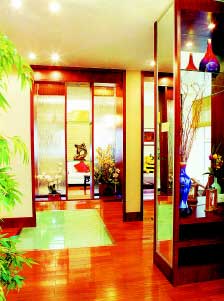 作为与公共空间的区分,玄关边上鞋柜缓和了空间的视觉感,增加使用效益与机能美学。图片提供鸿扬装饰乳白色墙面与海蓝色门面玻璃形成强烈对比,加上深红色木地板,就像一幅 油画 。图片提供元洲装饰 天花与地面的造型相呼应,创造出柔和舒适的感觉,而玄关柜则用花瓶简单点缀,内藏丰富的储物鞋柜空间,不仅具有使用功能,而且给空间注入一股新鲜的活力。