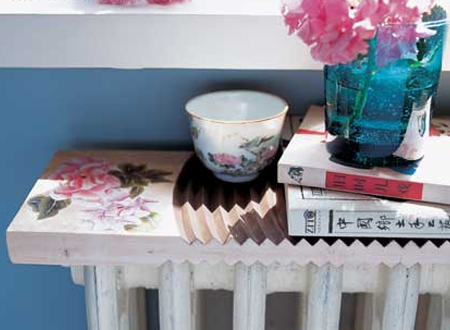夏天不用暖气了,就在暖气片上搭一块搓衣板,放点零碎东西。普通搓衣板不好看,用水粉在上边画上粉红色的牡丹花,立刻就变漂亮了。如果是新买来的搓衣板,要把上边的蜡磨掉才好着色。