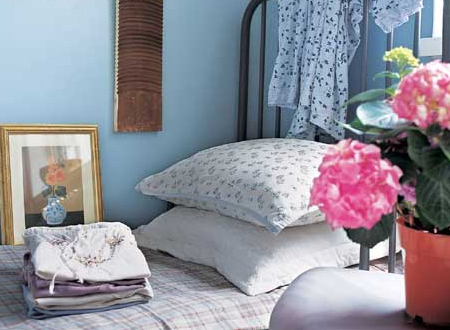 搓衣板的其他部分刷上棕色染料弄成旧旧的样子,就可以挂在墙上当装饰。卧室里摆的花是粉红色的八仙绣球,花期很长,能开3个星期。