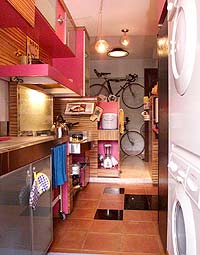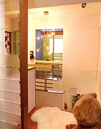 过了通道,就是色彩亮丽的厨房。脚踏车前的那个饭锅架子,可以推进左边的“柜子”藏起来。 |  从楼梯旁的小阳台,可以对望“对面”的房间,别具巧思。 | |