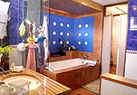 楼上浴室的设计,宛如酒店的温泉浴室。浴缸旁有个“小水池”,水从这里流出,很有情调。 | |