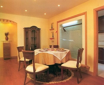 厨房外一角辟为餐厅,圆形餐桌与圆形地毯是和乐团圆的传统中餐所需要的。