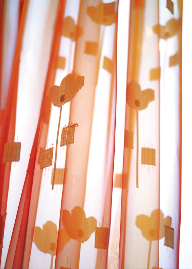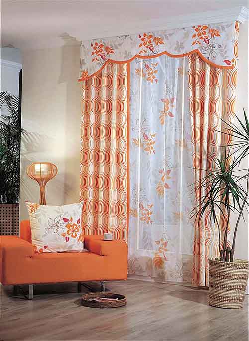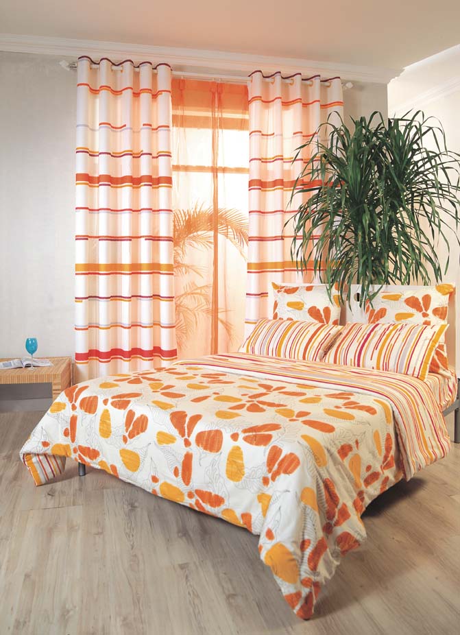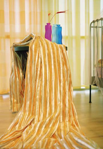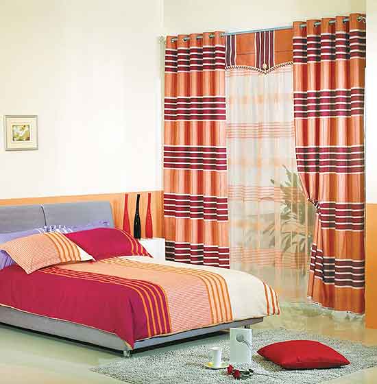 简洁、流畅的风格表露无遗,帘幕上橙色与乳白色条纹让热情与安静和谐而统一。运用几种纯度和明度颇高的色彩互相衬托对比,更适合追求现代感的前卫一族。