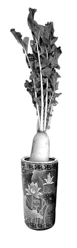 不用过多强调设计技巧,而利用素材自身的特色,比如,韭菜和西芹有较长的叶茎,可以利用它的外形随意插入水中,效果最佳。