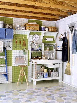 杂物间其实是一个非常好的收纳空间。很多新的、旧的、大的、小的、物品都可以在这里找到它最合适的“栖身之所”。如图所示,采用喷涂成草绿色的方形小钉板,结合各种各样的小挂钩,用来收纳最常用的各种器具;靠近天花的地方设一排木隔板,用来存放不是经常使用的各种器具。如此巧妙而又实用的设计,实在是值得推广!