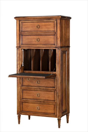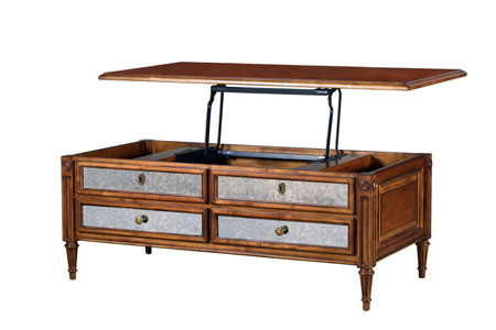 咖啡桌与七斗柜的设计更显别出心裁。保持雕花、圆腿等古典元素的同时,将时尚的生活理念融入其中,咖啡桌的面板可升起,方便使用,下部贴有古董镜的抽屉既美观又满足了储物的功能性。七斗柜充分加强了对空间的把握,体积纤细,不仅考虑到卧室大量储物的空间需要,还设计了中部可翻面板,供人们看书阅读。