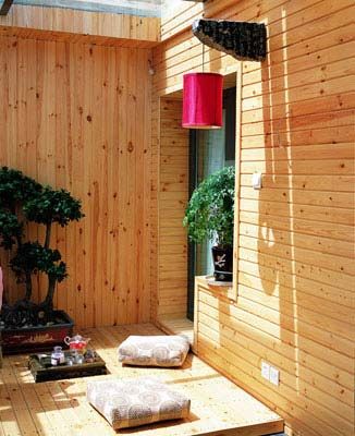 三楼的阳台宽阔独立,采光极好,设计师将浴缸搬上阳台,颇具创意的阳光浴室温情洋溢,处处显露生活情趣。自控窗帘、近2米的大浴缸、实木地台、宽阔的景观视野……令沐浴舒适无比。 6、茗茶与禅意