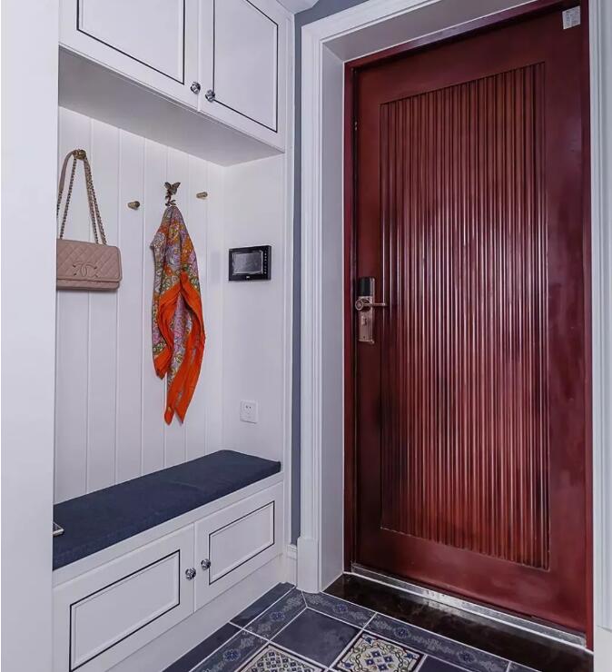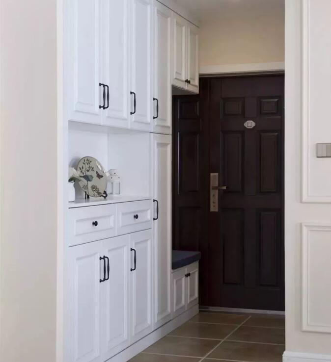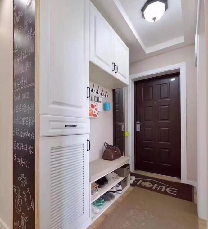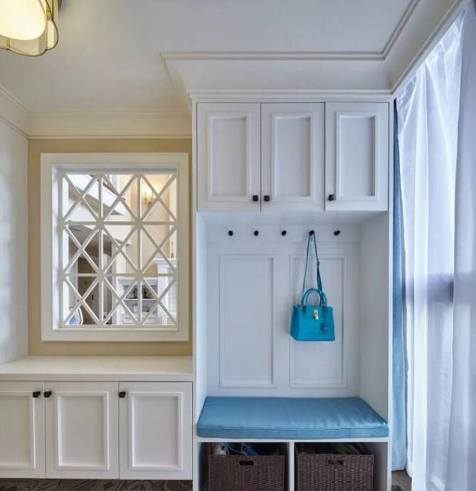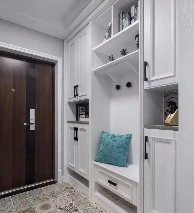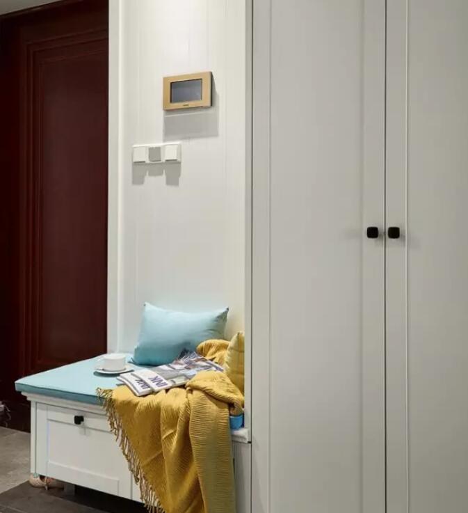 单独做一个嵌入式鞋柜,然后把换鞋凳和钩放在侧面。换鞋凳上方可制作隔板架和吊柜。如果选择白色和木质橱柜,不会让人感到沮丧。