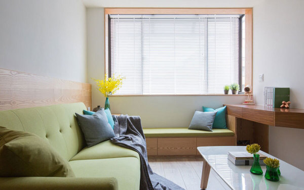 4. 客厅凸窗可以用得很好,然后设计成储物空间。凸窗底部可设计成抽屉或隔断,墙壁可设计成架子,放置一些书籍或手工艺品,既美观又适用。