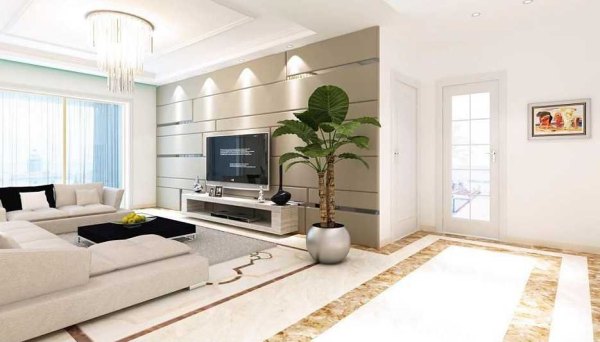 客厅的装饰设计应与其他房间的天花板、墙壁和家具材料相统一。同时,建议选择小光源。枝形吊灯可用作主灯,或在天花板上安装一些聚光灯作为辅助光源。
