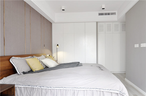 然后让我们看看主卧室的设计,主人没有使用太多的颜色,只是用灰色和白色来创造一个非常简单和明亮的卧室。白色衣柜采用屋顶设计,可节省空间,容量大。卧室中间有一张实木床,配有白色温暖的被子,让主人享受最舒适的睡眠。