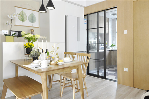 我们在这里看到餐厅和厨房。店主营造了清新自然的生活氛围,可以选择木制餐桌和橱柜门,墙上挂着美丽的叶子贴花和美丽的桌子。花。为了保证厨房有足够的光线,店主在餐厅和厨房之间安装了钢化玻璃推拉门。