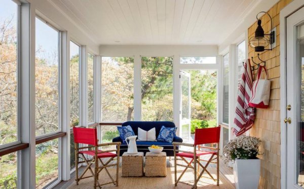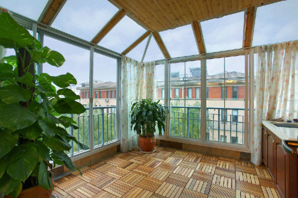 这种通常适合大面积,是给主人带来小资产阶级生活情感吸引力的一种方式,把布沙发、红花、绿植物放在空间里,是一种活泼的场景视觉感觉,然后搭配欧洲门窗,这样的阳台不仅豪华清新,反映了主人独特的生活品味。