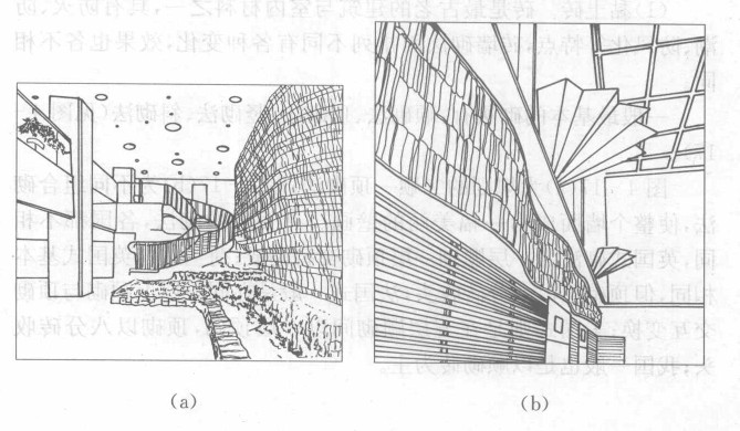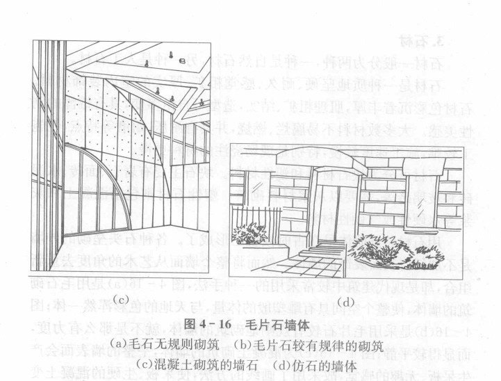 用石材装饰墙体早在古时候就已形成了。各种石头垒砌的外墙是不加任何表面装饰的墙体。然而将整个墙面从艺术的角度去重新组合,却是现代建筑中较常采用的一种手法,图4—16(a)是用毛石砌筑的墙体,使整个空间具有雕塑般的体量,与天地的色彩浑然一体;图4—16(b)是采用毛片石较有规则地砌筑的墙体,就不是那么有力度,而显得较平静;图4-16(c)为混凝土砌筑的墙体,平整的墙表面会产生呆板、无趣的感觉,故采用了画线的方法,使呆板、生硬的混凝土变得柔和、肌理变化丰富,形成一个富有韵律、亲切的室内空间。