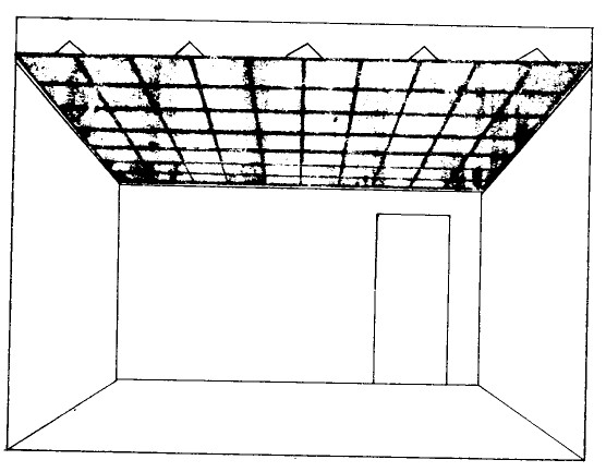 玻璃贴花吊棚方法与上述步骤一样,只是在棚顶安装日光灯,安玻璃时,在每片玻璃上贴塑料玻璃贴花纸。