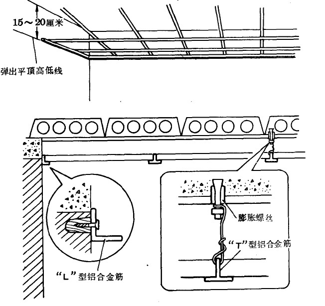 (3)弹线,打木枕。除墙上弹线外,平顶上最好也照面板位置弹线,以便确定吊筋生根的位置,吊筋位置要求每1.2米左右生一根,用冲击钻打眼,埋好膨胀螺丝;