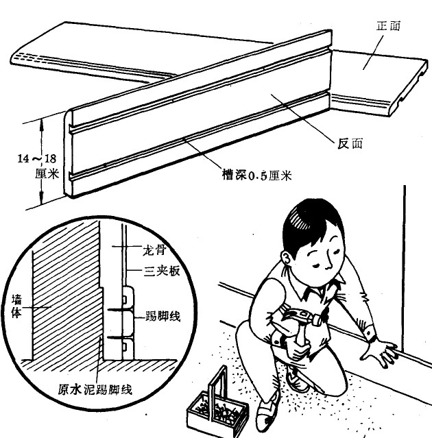 ①踢脚线的制作:选不易变形的木料做踢脚线,踢脚线的宽度为14-18厘米,正面的板厚的一面刨光,光面的顶角用挫角刨或直刨挫圆一踢脚的背面要做卸力槽,以防扭曲。卸力槽用二分或四分槽刨刨出,深度为0.5厘米;