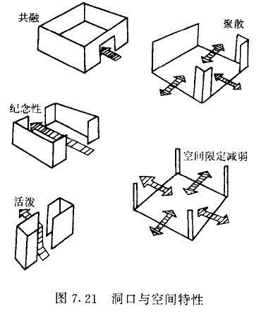 不同的墙体形成不同的包围状态,从而使空间形态特征相异。没有开洞的墙体形成全包围状态,空间限定度强,空间形态私密性强;而当空间尺度很大时,全包围状态创造了纪念性。当墙面开较大的口时,在开口处形成一个虚面,在虚面处形成内外空间的交流和共融的趋势。双开口墙面形成方向,产生轴线,空间形态指引性强;若减弱轴线时,则空间转折显现活泼,所以洞口的位置直接影响内部空间的流线组织、光线的质量、视线的流动,如图7. 21所示。